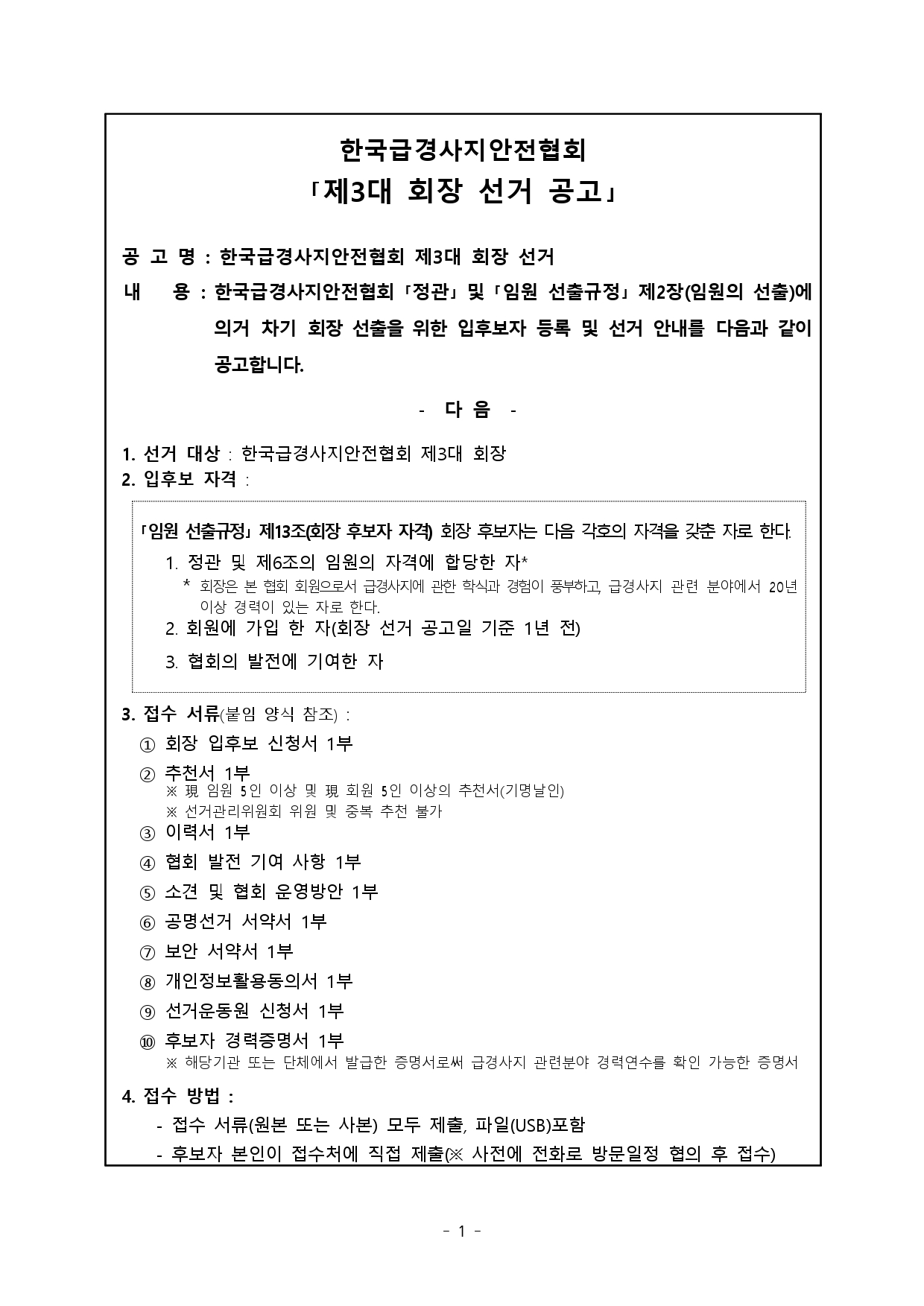 Çѱ¹±Þ°æ»çÁö¾ÈÀüÇùȸ Á¦3´ë ȸÀå ¼±°Å °ø°í